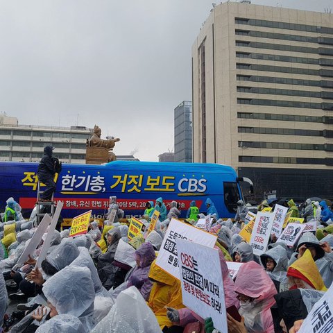 광화문 광장에서 CBS의 왜곡보도 행태를 규탄하는