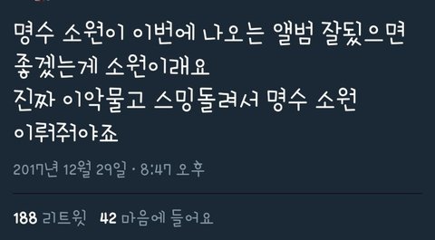 비긴어게인 노래나올때 진짜 노래넘 좋아서 놀랐어. 노래 중독성 짱인듯 아직도 내귀에 멤돌아ㅠ 팬미팅중에 명수가 자기소원이 이번앨범 잘됬으면 좋겠다고 했었거든. 이말 듣고 느낀게 우리 진짜 열심히 하자. 명수 소원 크게 이루게 해주자. 스밍도 진짜 열심히 돌리고, 투표도 열심히 하자. 우리 행복하게 해주고 웃게 해주는 명수랑 인피니트전체 소원 이루게 해주는거 어렵지 않은거잖아 그치?