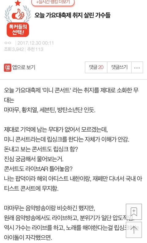 이게 배플임ㅋㅋㅋㅋ 두번째 베플보면 ㅅㅂㅌ은 live ar이어도 오픈마이크라 잘했다는건데