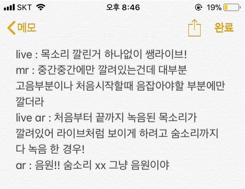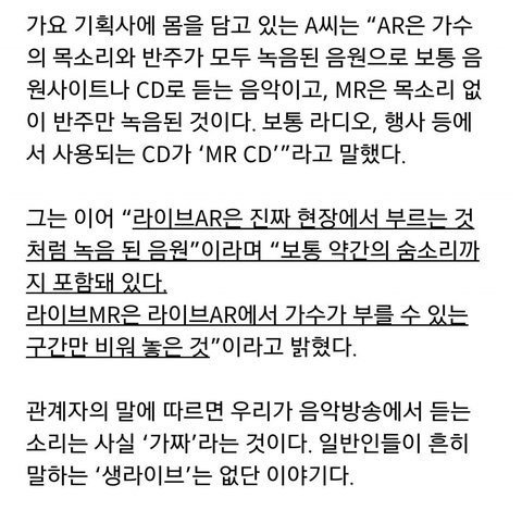 아니 관계자까지 live ar는 숨소리까지 녹음된 음원이라고 인정했는데 왜 갑자기 립싱아니라고 함?? 그리고 답답한게 live ar라고 쳐도 그위에 노래부르면 라이브될수 있다고 하는데 차라리 mr나 ar로 하고 그 위에 노래 부르면 될껄 굳이 숨소리까지 녹음된걸 갖다가 그위에 부름??