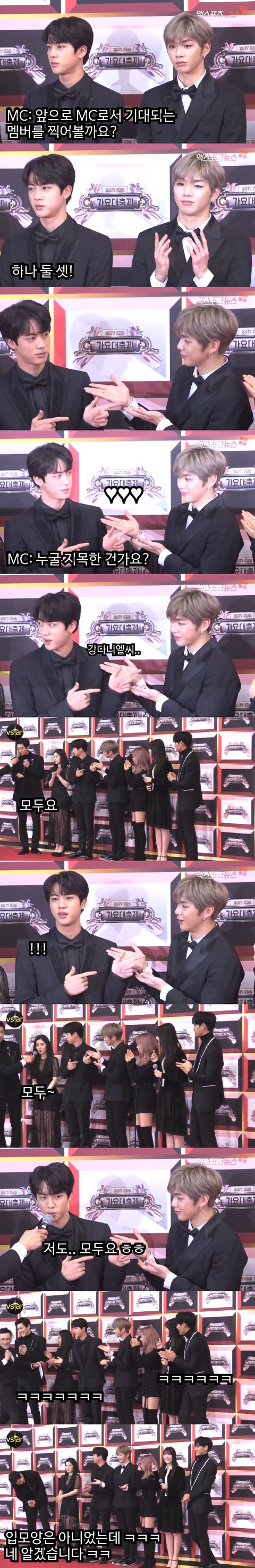 MC들 레드카펫에서 사회자가 기대가 되는 MC가 누구인지 선택해보라고 하니까 둘이 띡 서로를 지목했어. 그런데 갑자기 옆에서 하나같이 모든MC가 다 기대된다고 인터뷰를 하는거야! 서로 진선배님, 다니엘씨 이렇게 말하고 확인도 했는데.. 둘이 침꼴깍 당황해가지고 서로 계속 저 포즈..ㅋㅋ 그러다 자기인터뷰 차례오니까 저 상태에서 급하게 모두요~ 이럼서 바뀜. ㅋㅋㅋ 다니엘도 능청스럽게 에브리바디 포즈로 변경하더니 아무일 없었다는듯 ㅋㅋ 아놔~ 이거보고 빵터졌어