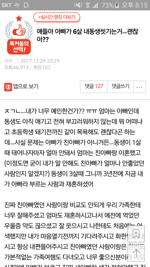 대충 요약하면 글쓰니 나이는 모르나 아마 중학생으로 추정하고 여동생은 6살이고 엄마가 동생 1살때 이혼하시고 3살때 재혼해서 새아빠가 너무 잘해줘서 행복하게 잘 살고 있다는데.....문제는 동생이 내년에 7살이라서 글쓴이가 아빠한테 본인이 이제부터는 씻기겠다고 했는데 새아빠란 사람이 쫌만 더 크면 이제 더이상 작은딸의 "벗은 몸" (이게 논란의 말)을 볼수없으니까 작은딸이 먼저 거부할때까진 계속 새아빠가 씻기겠다는 글인데.....참 저도 딱 글쓰니 동생나이대 딸 이랑 4살 딸 이렇게 딸둘엄만데 저희 남편은 올해부터 큰딸은 안씻기고 작은딸만 씻기거든요.....저는 글쓰니의 고민이 충분히 공감이 가고 아빠랑 다시한번 진지하게 대화를 해봐야 하는게 맞다고 생각하는데 다른분들은 어떻게 생각하시나요? 요즘 세상이 워낙 흉흉해서.....특히 딸가진 부모들은....