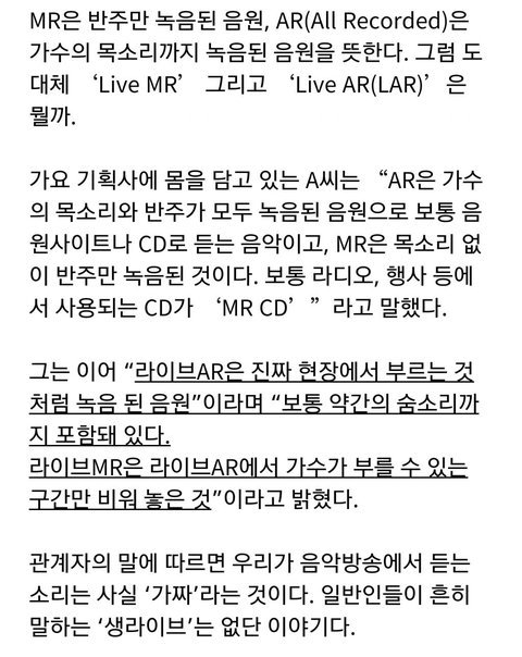 여기서 어떤 애들은 아니 live ar에다가 라이브불러도 돼자나!! 이런 소리많이 하던데 오히려 그쪽에서는 가수가 live ar위에 라이브한다 이런식으로 말한게 이상하다고 생각함 나 같아도 그러겠다 그냥 ar나 mr위에다가 라이브로 하면 될것이지 꼭 숨소리까지 녹음된 live ar에다가 라이브를 부르겠다고?
