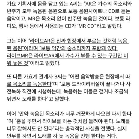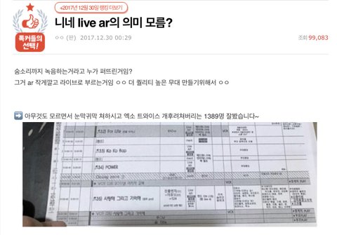 애초에 AR 하는 얘들이랑 안하는 얘들이랑 비교하는게 뭐가 잘못? 솔직히 안하는 얘들은 그만큼 리스크를 갖고 가면서 열심히 라이브로 부르는건데 그거에 비해서 AR는 솔직히 가수로서 좀..