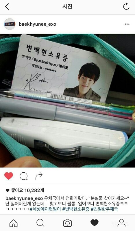 백현이 우체국에서 분실물을 찾아가라며 연락이 왔다고 본인 인스타그램에 글을 올림