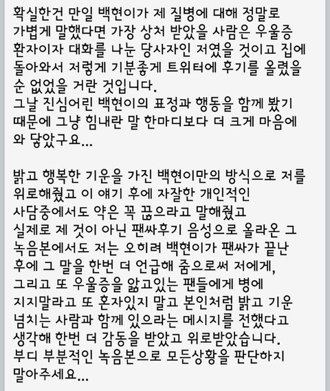 지금 2차 가해를 하고 있는게 자기들이라는 걸 모르는 것 같다. 정작 당사자는 '난 위로를 받았다. 때문에 이 일로 더 이상 자신의 소중한 사람과 행복한 기억에 상처를 받는 걸 원하지 않는다' 고 글을 올렸어. 이 말은 비공개 팬싸에서, 일대일로 이야기한 것이기도 하니까. 난 이게 타팬들과 머글들 입에 오르락 내리락 거리며 욕먹어야 될 일이라고 확정지어 이야기는 못하겠다. 잘 판단하고 얘기해주길 바래.