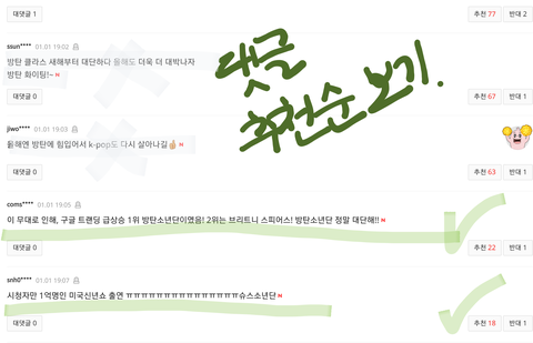 댓글도 왠만하면 풀네임이나 BTS써야지 어디 인기 집계할때 도움된다는데 그것도 유의해줌 좋겠다!
