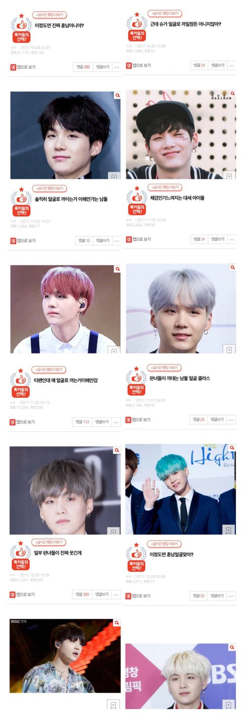 1. 슈가 - 눈정화~ 댓글(36) 조회 5,651 추천 93http://pann.nate.com/talk/3400347952. RM - 솔직히 보면~ 댓글(173) 조회 22,362 추천 259http://pann.nate.com/talk/340037766 3. 지민 - 갈수록 미모~ 댓글(35) 조회 10,743 추천 96http://pann.nate.com/talk/340038906