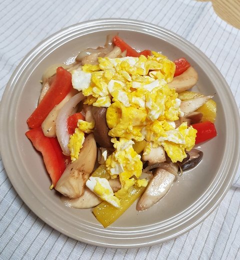냉장고에 남아있던 버섯이랑 파프리카랑 양파랑 계란 굽고 볶아서 이렇게 한끼 해결!
