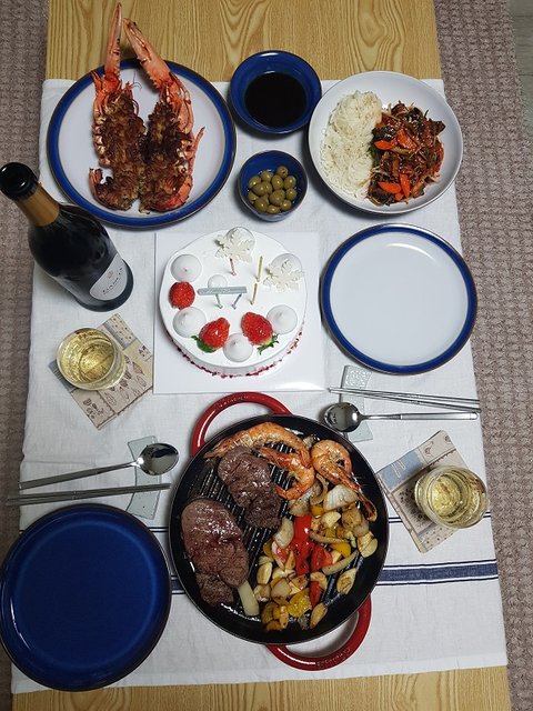 마트에서 파는 랍스타 1만원 정도에 사서 오븐에 굽고 쇠고기 안심 스테이크와