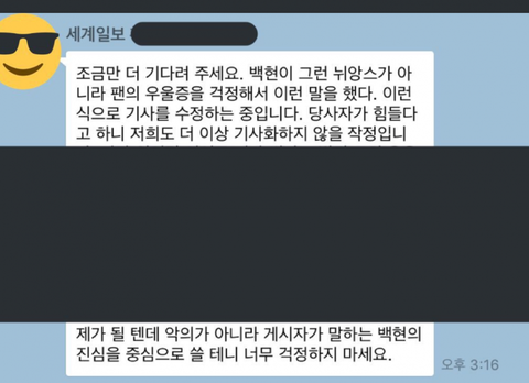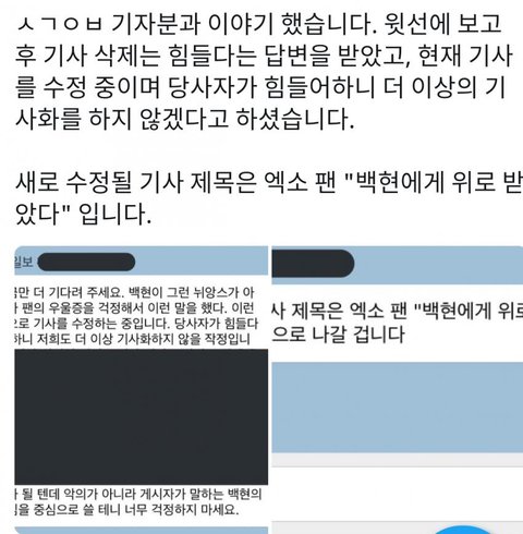 경솔발언한것도 맞고 다 맞음 근데 저 기사가 왜 주작인데? 저 후기올린사람은 더 이상 자신과의 얘기가 퍼지지않았으면하고 더군다나 백현한테 위로받았다는게 팩튼데?