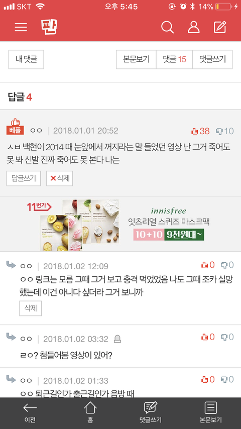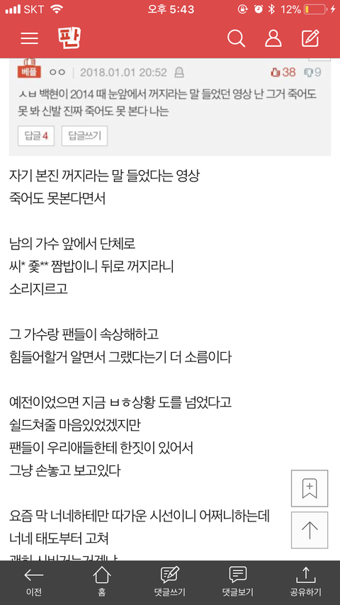 ㅇㅌ에 이런 글이 올라왔는데 저 댓글 단 애 나거든? 난 단순히 그때 그 영상 마음 아파서 못 본다 한 거고 난 저기서 말하는 ㅉㅂ 말을 하지도 그렇다고 그 가수를 깐 적도 없는데 내가 잘못한 거야? 내가 내 가수만 생각하는 건가? 심지어 그 꺼지라는 말 타팬이 한 것도 아니였었는데?