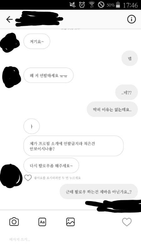 인스타에서 어떤여자 팔로우했다가 언팔했는데 갑자기 디엠으로 왜 언팔하냐면서 따짐ㅋㅋㅋㅋㅋ언팔은 내맘아니냐
