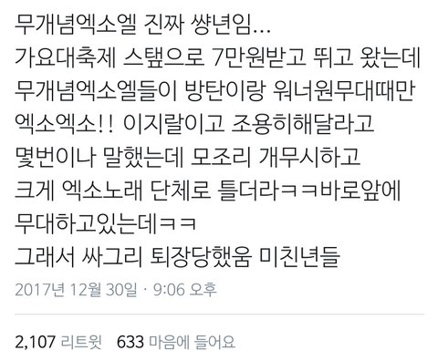 진짜 나 엑소팬이었는데 진짜진짜 무개념들 하는짓 보면 더이상 못버텼음..그래서 탈덕...