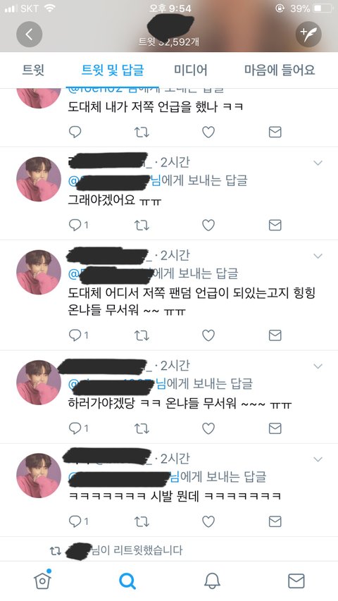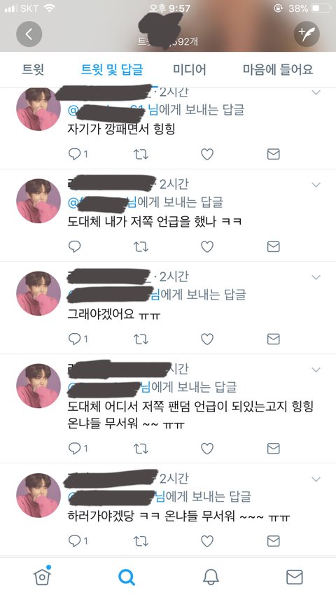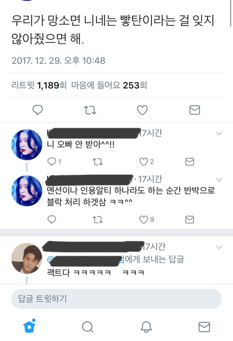 나 정말 이해 안 간다 너 저런 글 인증도 없이 믿냐? 너 그거 알아? 우리 팬이 자기 머리 때렸다고 한 애 알티 6천 넘고 봤다는 사람도 있었는데 주작이였던 거 사과문까지 쓴 거 봤다는 사람도 사과문 쓴 거? 저런 거 믿고 탈덕? 웃기지 마 진심