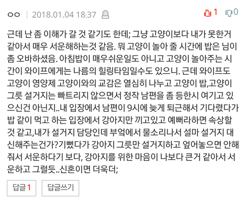 네 저 동물 좋아합니다. 그런데 좋아하는거랑 키우는건 다르다 생각합니다. 눈으로 보고 만지는 걸 좋아하는거지 밥주고 물주고 상전모시듯이 그러는건 별로 좋아하지않아요. 그런데 고양이가 먹은 그릇을 제가 설거지하라뇨. 말도 안되는거죠.