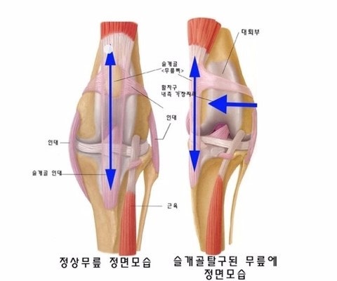 슬개골이란 무릎 근처의 뼈인데 움푹 파인곳에 들어가 있어야할 슬개골이 어긋나서 안쪽이나 바깥쪽으로 튀어나오는 증상을 말합니다.