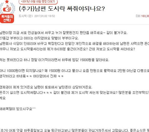남편회사 식당이 인테리어 바꾸고 확장한다고 한달간 개인적으로 해결을 해야하는데 남편은 사먹으면 돈아까우니 저보고 도시락을싸라는데 제가 8시30분 출근이거든요? 근데 저보고 도시락을 싸라네요?