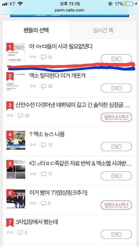 솔직히 엑소팬들은 방탄이 죽든 살든 진짜 관심 1도 없는데매번 톡선 올리는것도 그렇고 너넨 엑소와 엑셀에 대한 관심이 지나침엑소가 싫으면 안보고 안듣고 안사면 되잖아
