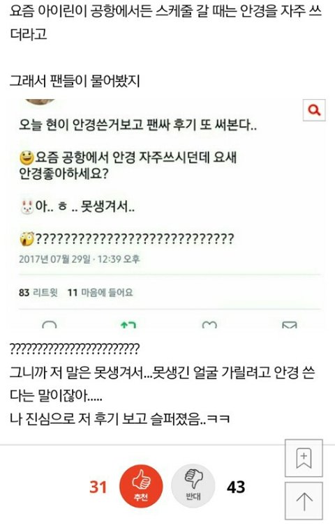 아이린이 안경 쓰는 이유가 망언같다는 글에 반대수