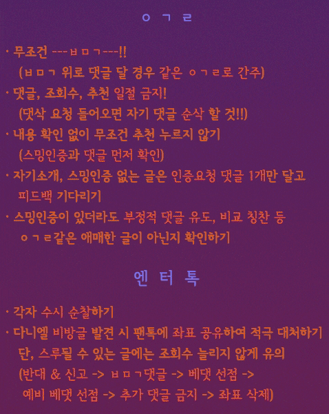 글고 팬톡 ㅇㄱㄹ에게는 ㅂㅁㄱ도 달지 않는 걸로 하는게 어떨까 해서 댓글 일절 금지로 바꿔봤어~