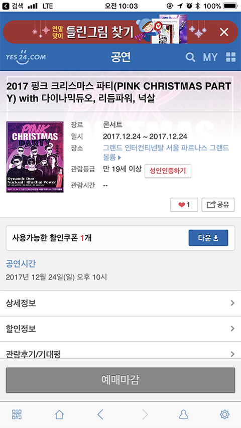 제가 간 공연은 모든 예매 사이트의 공연/콘서트 메뉴에서 티켓을 판매했습니다.