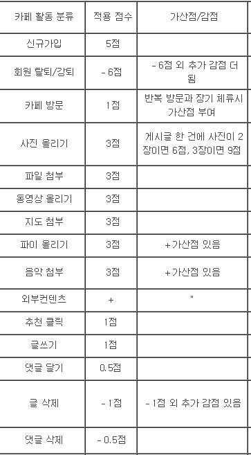 이러니까 쭉알이 언금안하지.. 사진에 대한 설명 저거 카퍼ㅣ점수임 저걸로 카페 순위 높고낮음이 정해지는건데 ㅉㅃ은 상업화카페라 저게 ㅈㄴ 중요