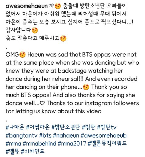 하은이가 인터뷰에서 누구 제일 좋아하냐니까 당연히 방탄이져~~! 다좋아여 이러구 방탄오빠들이 제가 춤출때 못봐서! 그게 넘 아쉬워여 ㅠㅠ 이랬는데 지민이가 보고있었어 하은아!!! 성덕이다 야.. 나도 이왕 방탄할꺼 십년만 늦게 태어나서 지민이가 귀여워할 어린애였음 좋았을껄....껄껄껄