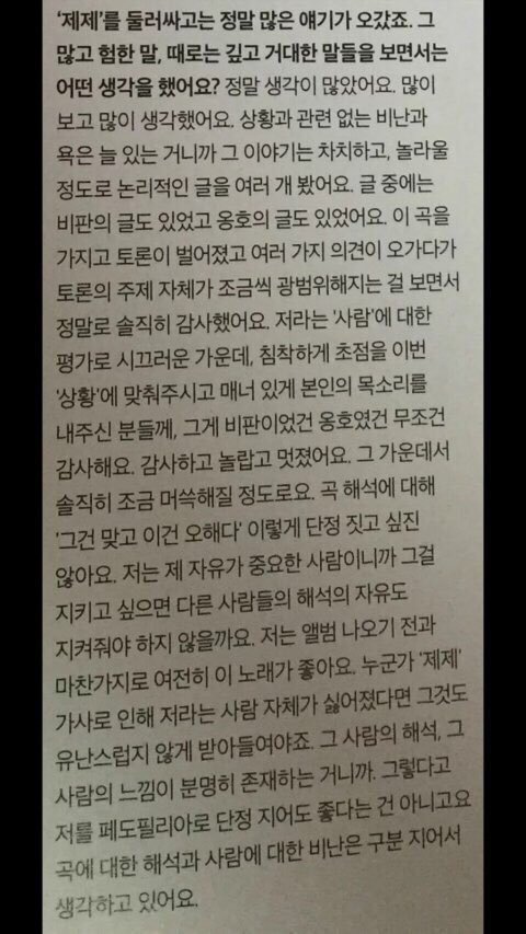 그리고 그런거 하나하나 해명하거나 아니라고 팩트 들면서 인터뷰 했던적 있어? —(( 위와 마찬가지로 마녀사냥인데 그런 터무니없는 논란을 아이유가 직접 하나 하나 해명하고 피드백 할 필요가 있나? 그리고 인터뷰는 했어 해석의 자유는 존중하지만 자신이 로리타는 아니니 오해말아달라고 한 바 있음.