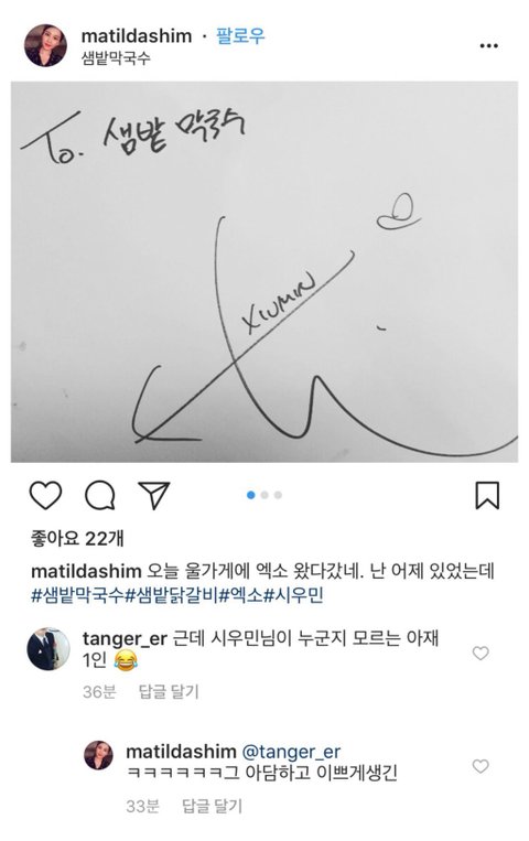 좀전에 시우민 새목격담 뜸(↓밑에 어그로 개소리왈왈 무시해)