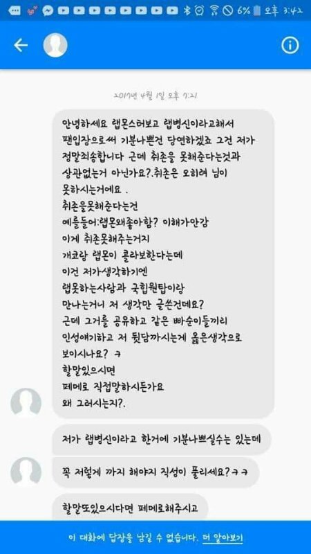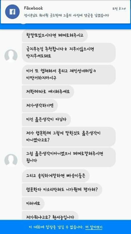 이미 데뷔한 05년생인 에이칠로가 ㅍㅂ에 방ㅌㅅㄴㄷ ㄹㅁㅅㅌ 보고 랩병신이니 뭐니 해대서 한 아미가 그글 공유해서 반박하니까 페메로 저렇게 말함.05년생이라고 어리다고 쉴드불가.05년생이 저렇게 어린애가 저런 워딩 써가면서 말했기때문