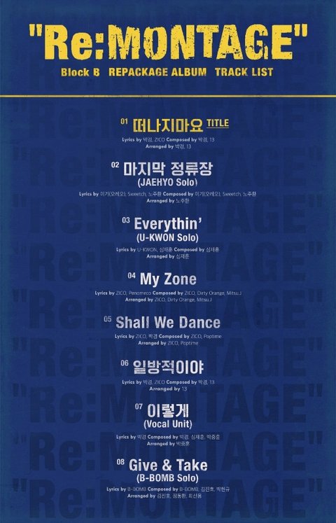 기존 몽타주 수록곡들에 새로운 타이틀곡 '떠나지마요'와 재효 솔로곡 '마지막 정류장', 유권 솔로곡 'Everythin' 이 추가됐어.