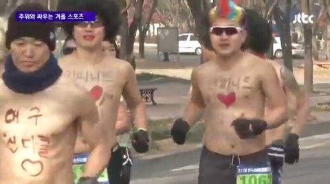 궁금해서 기사한번 찾아보니까 그대로 올라와있더라고 근데 뉴스 내용중에 "모두 웃옷을 벗었고, 상반신에는 가족의 건강은 물론, 결혼해달라는 내용도 적혀 있습니다."라고..혹시 저 두분이 인피니트의 아버지일수도 있다는 생각이 스쳐지나가는거야ㅋㅋㅋㅋ 자세히 보면 내아들 남우..라고 쓰여있기도 하고 무튼 그냥 그랬다고