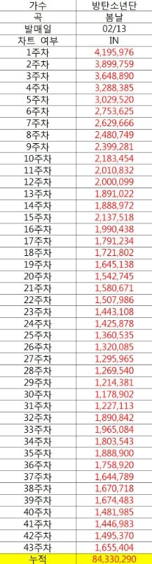 이게 왜 중요한거냐면 빅뱅이랑 위너말고 지금 남돌 1억스밍 한팀도 없어ㅜㅜㅜ 엄청 레어한거야 물론 일억스밍 엄청 대단한거고!!! 앞으로 봄날 1억스밍까지 천 몇백만 남은걸로 알고있는데 이거 달성하면 남돌 중에는 세번째, 차트인 남돌으로는 두번째 일억스밍 되는거야!!!!