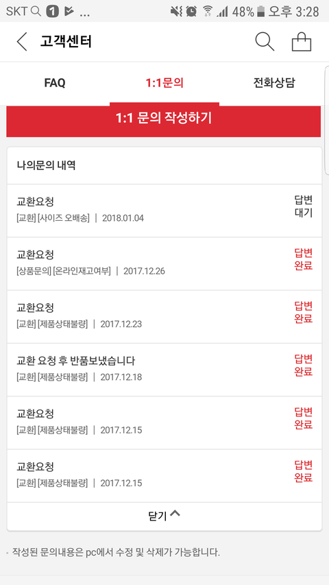 통화량이 많다고 연결이 안되서 1:1글에 다시 교환요청했습니다.
