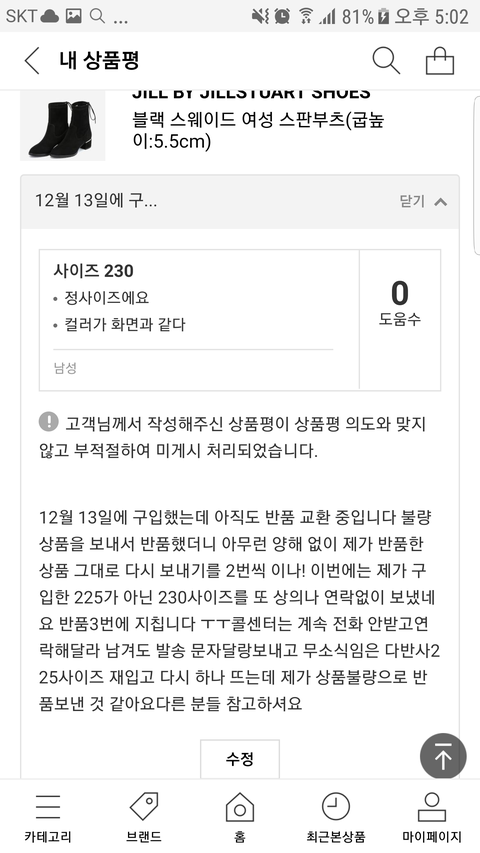 스웨이드 제품인데 상품 하자로 인해 교환 요청했습니다.