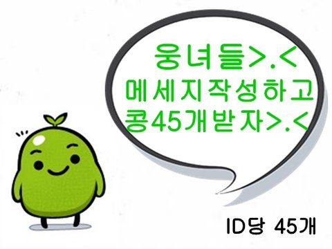 콩줍 2번 갤럭시8 감사이벤트로 9항목 메세지 작성시 메세지당 콩5*9=45개를 아이디 1개당 받을 수 있으니까 귀찮아서 안했던 웅녀들 있으면 이번 기회에 몰아서 받아도 좋을 것 같아!