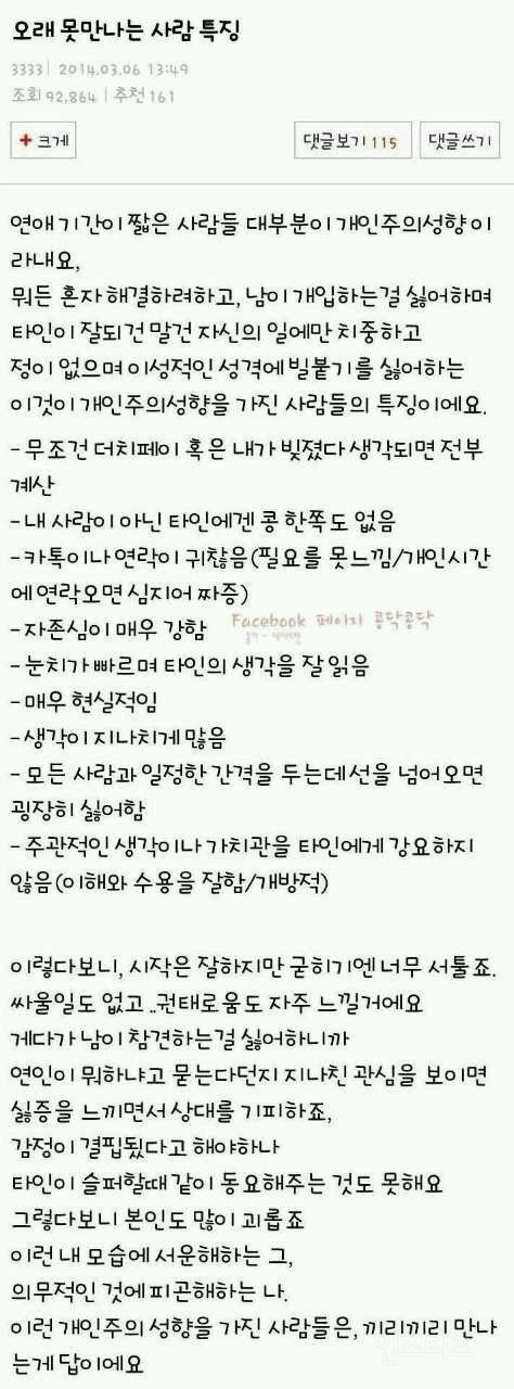 나진짜 소름돋았다 판에서 본 어떤 무서운썰보다 소름돋음 이건 연인뿐만 아니라 걍 인간관계 전체에 해당되는것같음 2n년 살았는데, 난 이상하게 초중고 아무 트러블 없이 잘 지냈는데 돌아보니 다 연락 끊겨있음 그때 당시 정말 친했고 행복했는데 지금 보니까 아무하고도 연락을 안함 그래서 진짜 친구 2명에 대학친구 2명만 남음;; 나는 이게 내 성격이 이상해서나 뭐 징크스정도로 생각했는데 이글 보고나니까 내가 개쩌는 개인주의라는걸 알게됨ㅋㅋㅋ 그러고보니 저번에 한 성격 검사에서 자기결정성, 자기주도성 이런게 만점 나왔음.. 너무 신기해서 주저리 써봤당