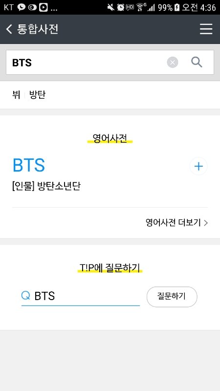 단어 찾아보다가 BTS 검색해봤는데 탄이들 나왔어ㅋㅋㅋ 혹시나 해서 다른 그룹들도 검색해봤는데 안 나오더라 신기행