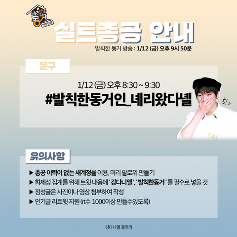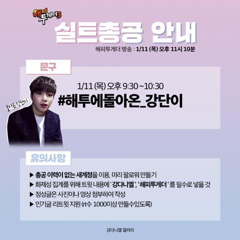 목 금 이틀 실총 모두 화제성 집계를 위해 트윗 내용에 '강다니엘' '해/피/투/게/더' '발/칙/한/동/거' 세가지 키워드 필수로 넣기각 날짜별 실총 해시태크와 함께 세가지 언급 필수!