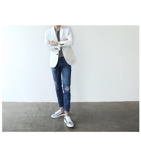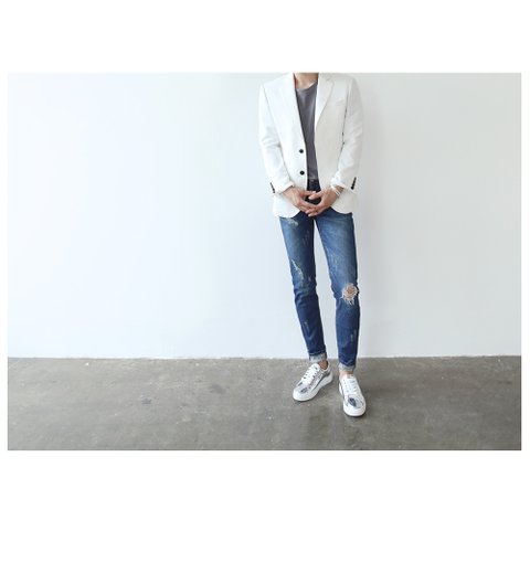 이런 밝은 아이보리화이트 자켓에 무지티입고 디스진 청바지입고