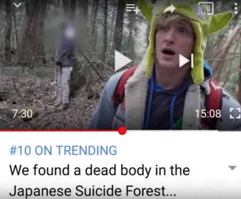 너네 유투버 logan paul알지? 구독자 1500만명 넘고 팬덤도 조카큼 쨋든 최근에 저사람이 지친구들이랑 일본여행 갔거든.. 브이로그도 찍고 그랬음 결국 카메라 들고 아오키가하라(Aokigahara) 숲을 갔음. 근데 거기가 원래 '자살 숲' 이라는덴데 스스로 목숨을 끓으려는 사람들이 주로 찾아감.영상 속 폴은 숲을 돌아다니던 중 자살한 남성의 시신을 발견함. 나무에 매달린 사체를 발견하고 충격을 받는함 근데 그상황에 친구들이랑 웃으며 “너 살아 있니? 장난하는 거 아니지?” 등의 농담을 나눔 (미친놈;;;) 그리고 시신의 모습을 클로즈업하는데 얼굴은 모자이크로 흐리게 편집됐지만 보랏빛으로 변한 시신의 손은 노출돼있음. 영상 끝에 "우울증과 정신질환, 자살은 농담이 아니다."라고 말한 것도 역시 문제가 됌. 장난하냐;; 슬픈 음악을 바탕으로 진지하게 경고를 했다고 해서 자살자의 모습을 노출한 것이 정당화 되냐 심지어 오프닝에 "이 영상은 유튜브 역사의 한 순간으로 남을 것이다"라고 마치 자기가 대단한일을 해낸거같이 말함. 영상 타이틀도ㅅㅂ.....