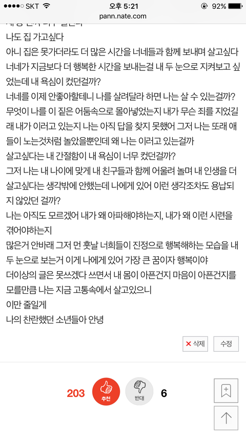 말하자면 그 애랑 나랑 실친인 관계이고 나한테 자기 계정까지 알려줬어 그래도 내가 이렇게 마지막으로 글까지 썼는데 잘 못되면은 나는 글도 못쓰고 떠날텐데 너가 나 대신해서 이게 진짜 마지막이라고 나는 그래도 조금은 행복했었으니깐 그 마음을 조금이라도 담아서 마지막 글을 써달라고 부탁하면서 계정 알려줬어