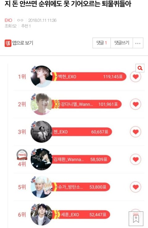 십만대 하트로 순수 화력이네 뭐네 다른 남돌들은 현질이라고 착각하며 지랄하는 중ㅋㅋㅋㅋ 하루종일 쟁여두다가 후반에 더 넣는 데들이 파다한데 웃기지도 않은 초반 십만대 하트로 남돌 원탑이라며 정치질 중. 강다니엘도 후려침