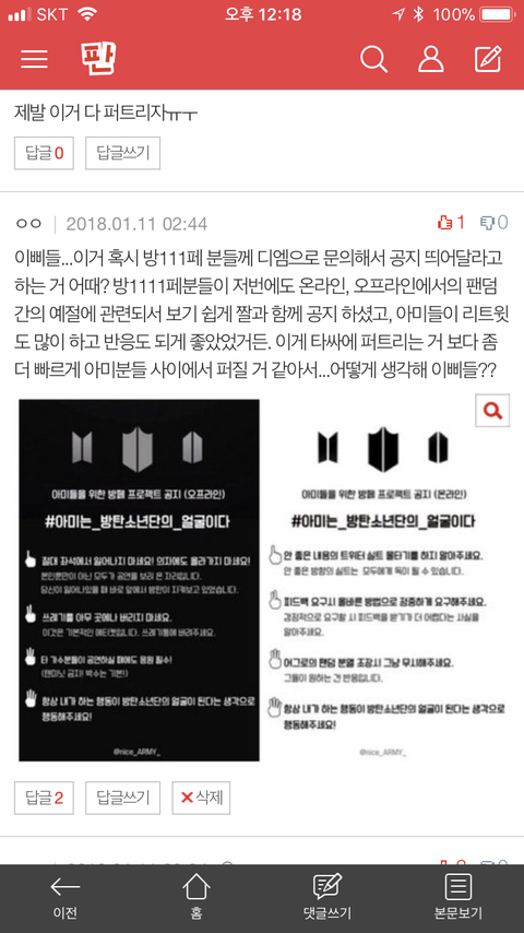 이삐들 나 어제 타가수분 수상소감 관련해서 쓴 게시글에 댓글 달았던 한 이삐인데 많이들 내 댓글을 본 것 같지가 않아서 고민하다 좀 더 많은 이삐들의 의견을 물어보고 싶어서 글 써. 밑에 캡쳐한 사진처럼 댓글 쓴 이삐인데 어떻게 생각해? 문의해도 좋을까? 난 아무리 소수의 팬이 그랫다고 해도 이번 일처럼 경솔한 일이 다시는 일어나지 않아야 한다고 생각하고 타가수분 수상소감 관련해서 쓴 게시글 댓글과 짹짹111이 보니까 다들 나와 비슷한 생각을 하고 있더라고. 방11페분들께 문의하는게 타11싸 퍼트리는 거 보다 빠를거 같고 방11페분들이 올려주시면 알아서 타싸에 옮기는 이삐들 많지 않을까 싶어서...댓글이나 추천으로 의견 좀 알려줘 ㅠㅠ 내가 섵불리 행동하면 안될 거 같아서 ㅠㅠ