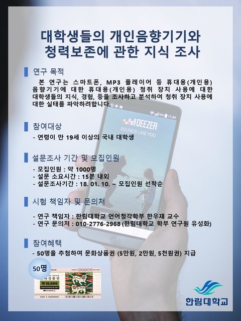 한림대학교 청각학과]에서 대학생들의 개인음향기기와 청력 보존에 관한 지식 조사’ 연구의 설문조사 대상자를 모집합니다!