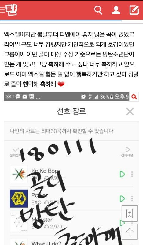 하나만 캡쳐해왔는데 진심으로 많은 엑소엘들이 방탄 대상 축하해준거 칭찬해~~~