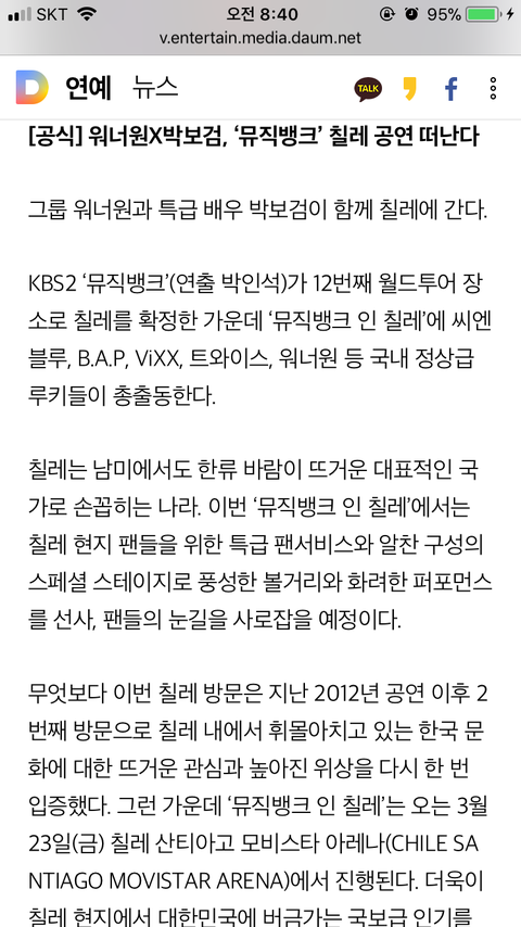 우리원 뮤뱅 칠레 공연떠난대!! 이동시간때메