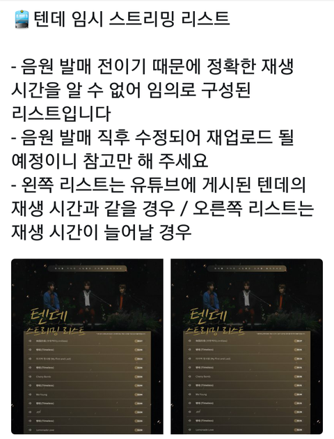 바로 다음에 나온 스밍리스트가 트위터에서 왼쪽사진이구! 맨 마지막 스밍리스트(맨 마지막 사진)가 트위터에서 오른쪽 사진이야! 노래 재생시간에 따라서 스밍리스트가 달라질 수 있으니 염두해 두자!