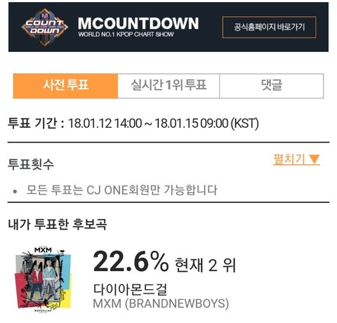 우리 지금2위야 1시간전보다도 2% 올랐어! 다들 15일까지 힘내서 1위해보자! 티비에서 오래보고싶어! 엠.넷 http://mcountdown.mnet.com/vote/vote